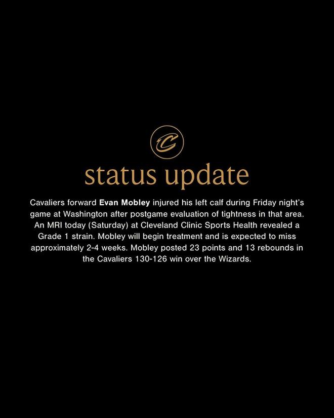 北京时间12月14日,骑士官方宣布,前锋埃文-莫布利在当地时间周五晚间客场对阵奇才队的比赛中,出现左小腿肌肉僵硬症状,赛后检查确认该部位受伤。其于今日在克利夫兰医学中心运动健康部接受核磁共振检查,结果显示为一级拉伤。目前莫布利已着手接受治疗,预计将缺席约2-4周的赛事。
